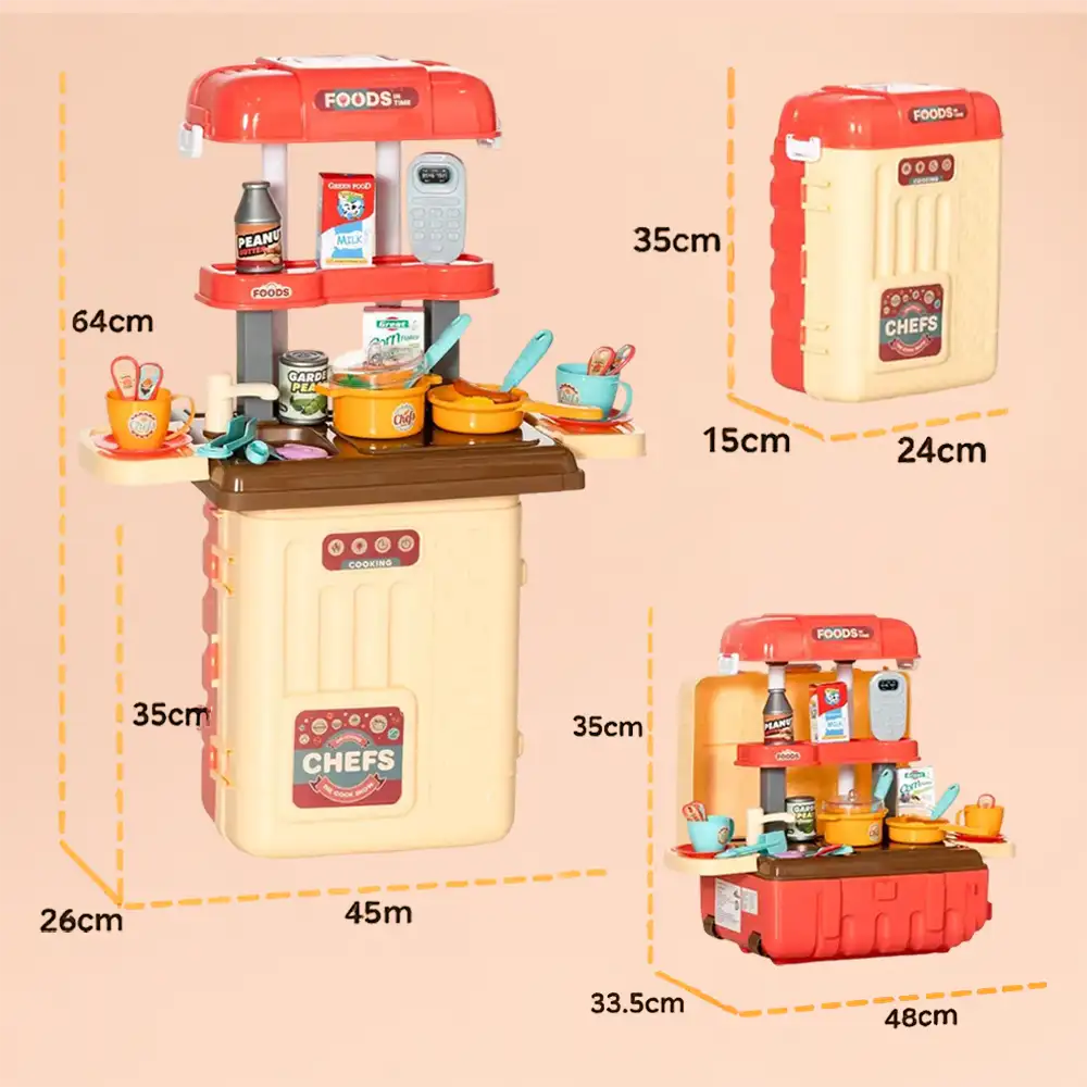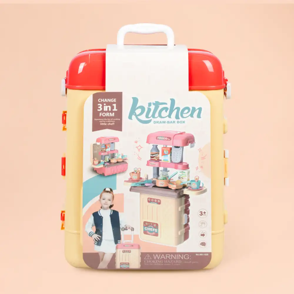 Fun and creative 3-in-1 kitchen play set designed for kids. Portable suitcase design transforms into a complete mini kitchen, perfect for imaginative cooking play anytime, anywhere.