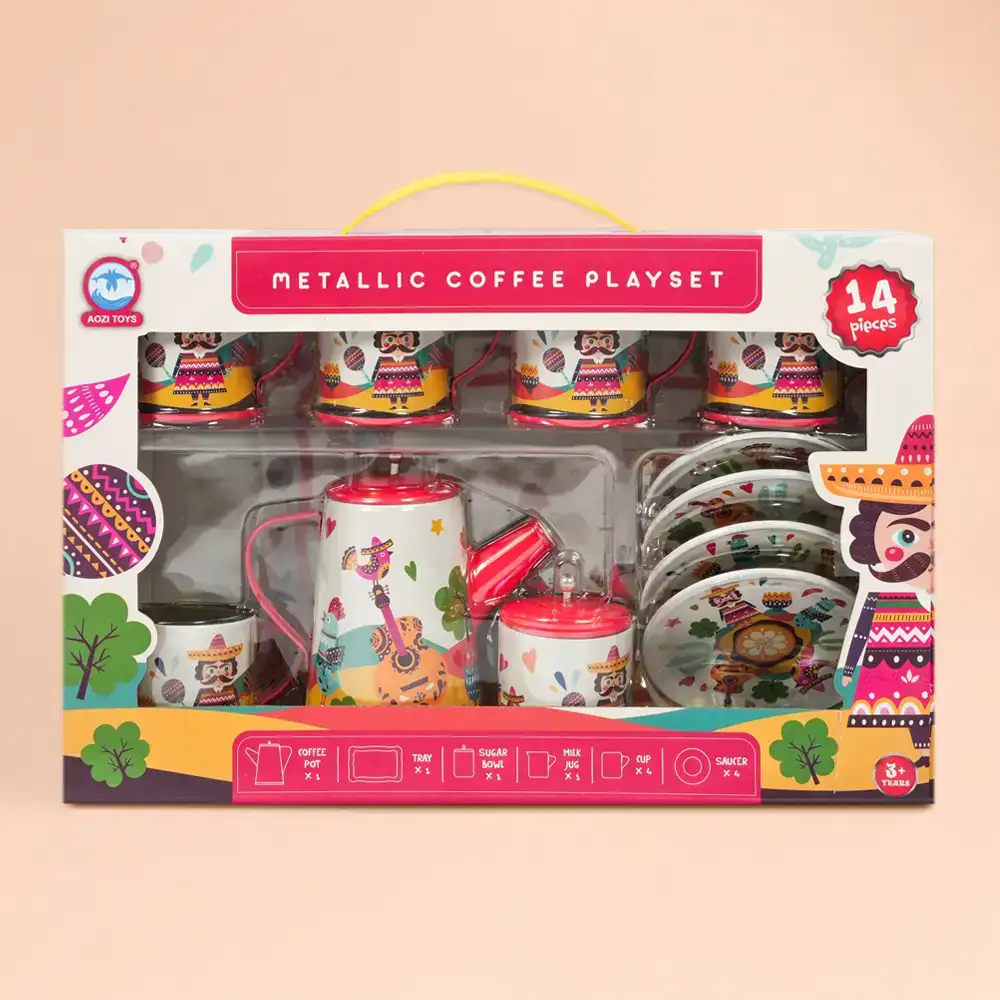 Bring imaginative play to life with this beautifully designed kids metallic coffee play set. Perfect for little hosts and creative minds, this 14-piece toy set allows children to enjoy pretend tea and coffee time just like adults. With colorful patterns and realistic accessories, it creates an engaging and fun role-playing experience.