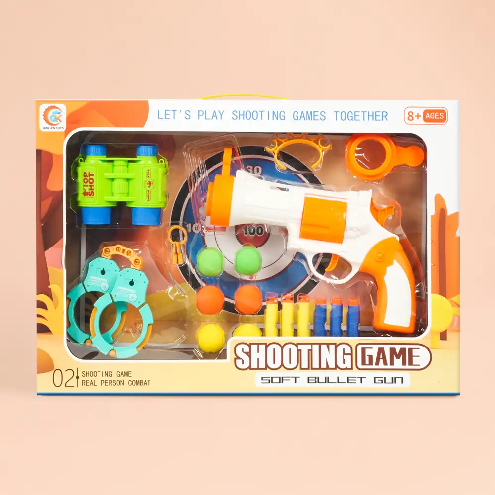 Fun and safe shooting game set designed for kids to enjoy interactive play. Comes with soft foam balls, target board, and accessories for exciting indoor games.